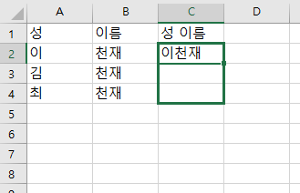 엑셀 자체에서 데이터를 합치는 경우도 있고 한글이나 워드 등 표에서 두 표 왼쪽 셀 또는 데이터, 그리고 오른쪽 셀 데이터를 합쳐야 하는 경우가 있습니다. 예를 들어 아래 데이터처럼 성과 이름이 따로 작성이 된 데이터를 받는 경우가 있습니다. 그런데 제가 필요한 자료는 성과 이름이 포함된 것입니다.
